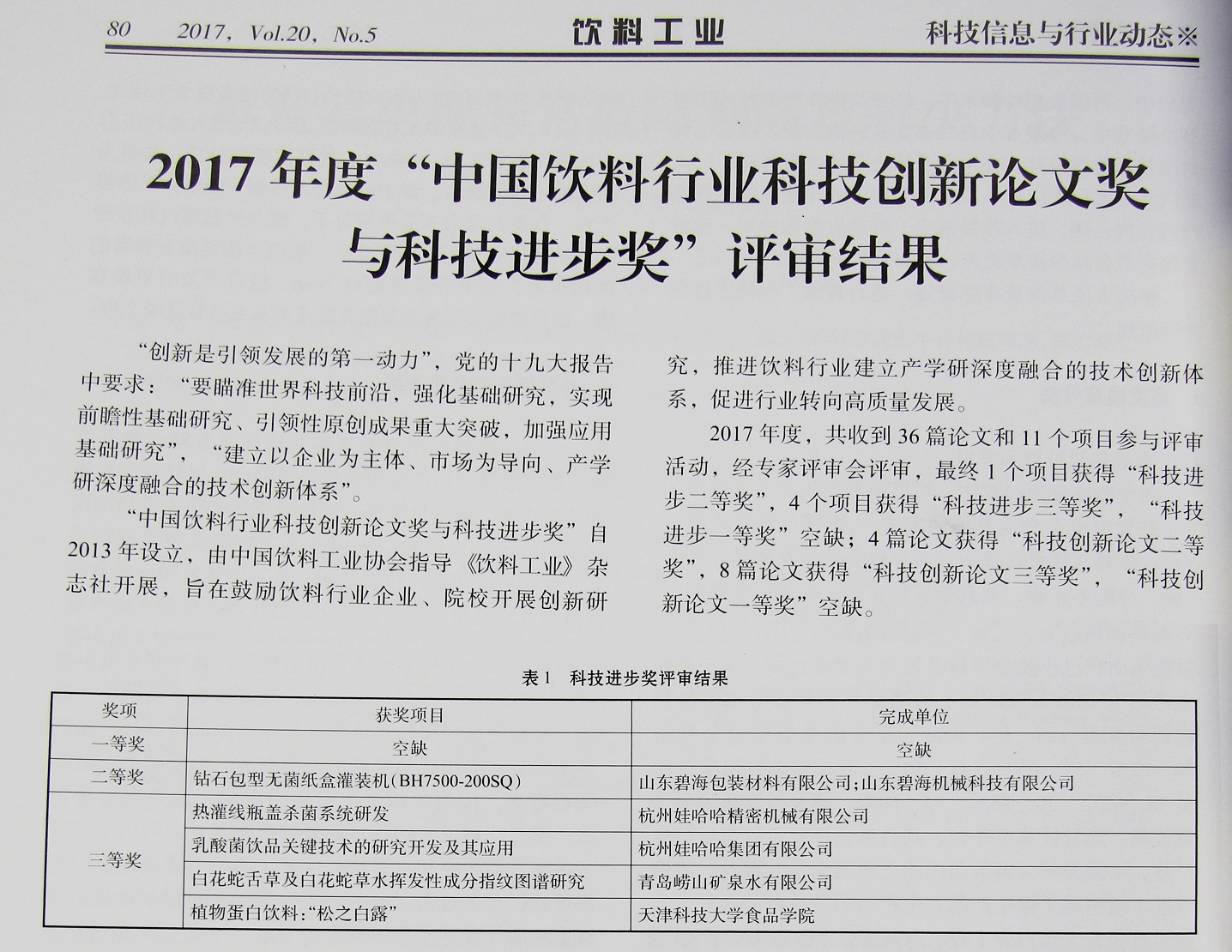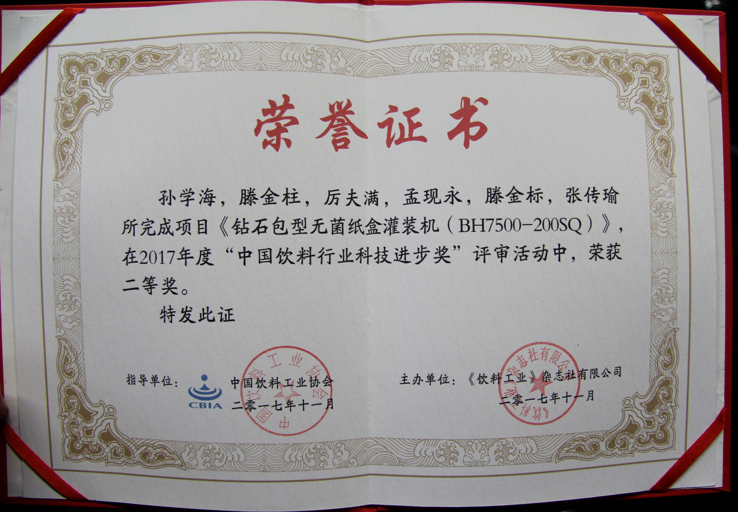 2017年11月21-24日,中国饮料工业协会年会、第八届中国国际饮料工业科技展、“2017中国饮料行业科技创新论文奖与科技进步奖”颁奖活动在上海新国际博览中心同期举行,经中国饮料工业协会评定,我公司的《钻石包型无菌纸盒灌装机(BH7500-200SQ)》项目荣获“中国饮料行业科技进步奖”二等奖。